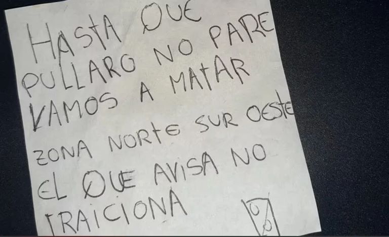La nota fue encontrada cerca del Policlínico PAMI 2 tras el desembarco de efectivos de Gendarmería y luego de fin de semana marcado por cuatro homicidios.