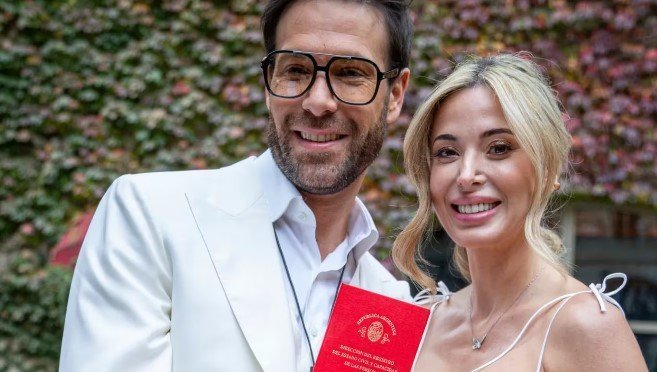 Tal como se pudo ver en las fotos, la pareja optó por un look off white. La modelo y conductora lució un vestido con efecto corset, breteles finos y detalles de encaje. Por su parte, el empresario inmobiliario llevó un traje blanco y unos anteojos de sol amarronados.