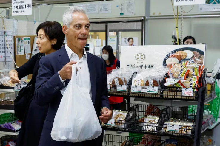 El diplomático Rahm Emanuel visitó la zona devastada por el tsunami y comió un plato lleno de rodajas crudas de platija, atún y lubina en un restaurante antes de comprar más productos locales en un supermercado