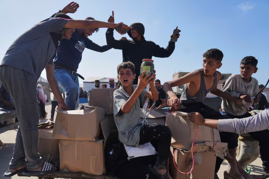 Niños y jóvenes palestinos muestran las cajas de alimentos que obtuvieron durante la desordenada entrega de ayuda humanitaria en Gaza (Foto: AP)