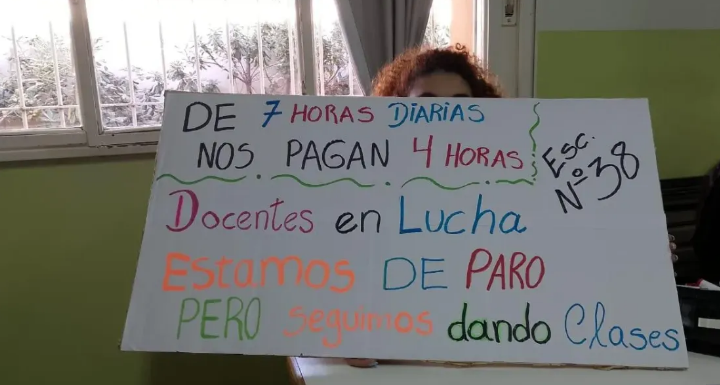«Los docentes de la escuela N°38 de Santa Rosa, estamos en lucha. Somos una escuela de jornada completa, trabajamos 7 horas diarias, impartiendo clases, acompañando y educando en el comedor y en el estudio de los estudiantes hasta las 15 horas», expresó el personal de ese establecimiento.
