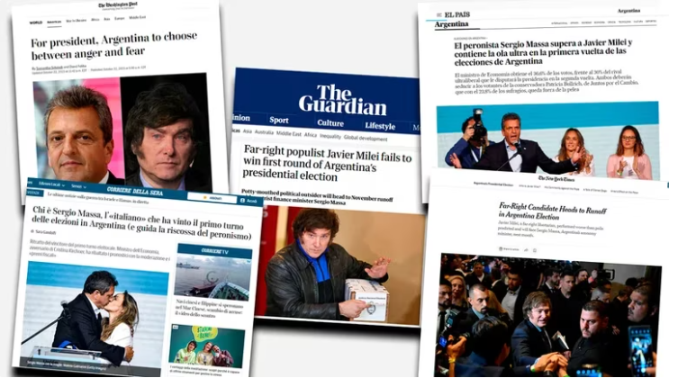 El pase a segunda vuelta de la elección presidencial argentina del candidato del gobierno, Sergio Massa, y el candidato de La Libertad Avanza, Javier Milei, fue noticia destacada en los principales medios de comunicación internacionales.