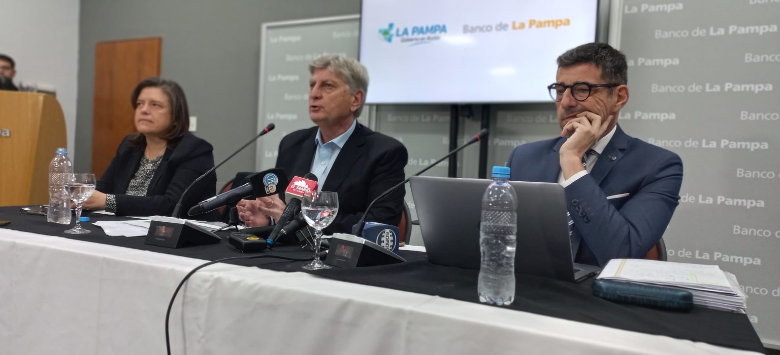El gobernador Sergio Ziliotto junto a la ministra de la Producción, Fernanda González, y el presidente del Banco de La Pampa, Alexis Iviglia, anunciaron este miércoles nuevas promociones, más límites de compras y líneas de créditos para las familias y empresas desde el mes de agosto.