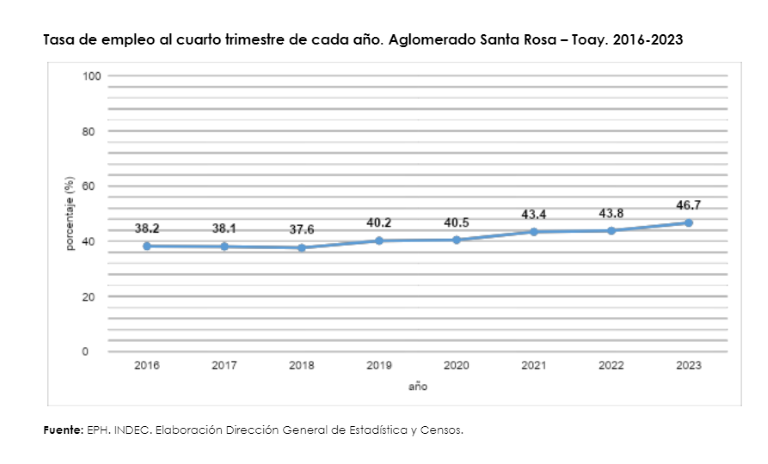 El nivel de desocupación en el aglomerado Santa Rosa – Toay en el cuarto trimestre del año pasado arrojó un 5,6 % por lo que, teniendo en cuenta la evolución de los niveles de desocupación en igual trimestre y retrocediendo hasta el año 2016, este es el número más bajo registrado.