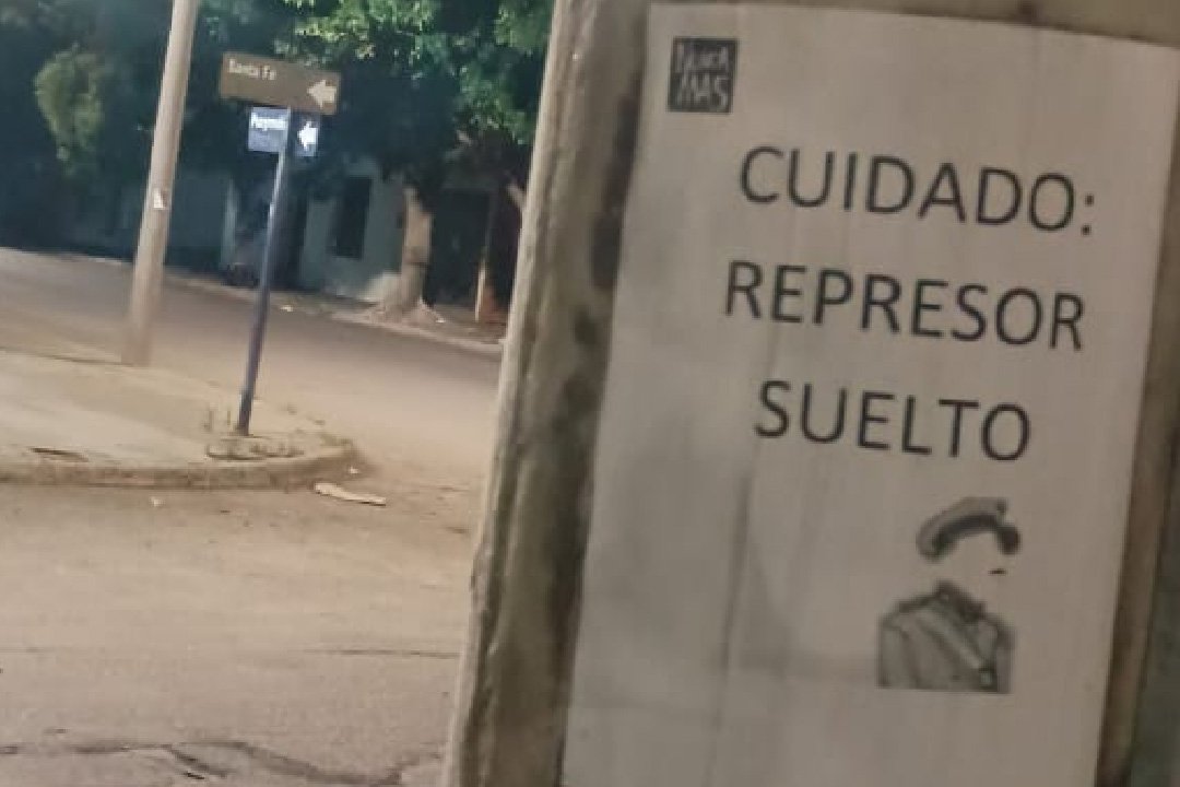 “Cuidado: en este barrio vive un represor”, alerta uno de los carteles pegados sobre una columna, mientras que otro tiene una foto del represor y expresa: “Reinhart torturador”.