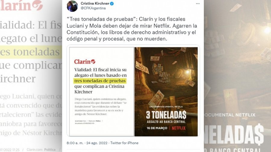 La publicación fue acompañada por un posteo de un titular de Clarín que decía "Vialidad: el fiscal inicia su alegato el lunes basado en tres toneladas...