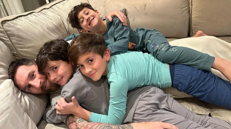 El crack rosarino posó junto a Thiago, Mateo y Ciro, recostados sobre un sillón de su casa en París. Su esposa los fotografió y lo compartió...